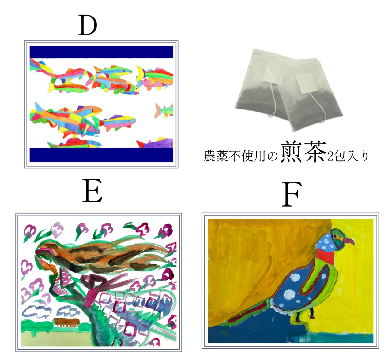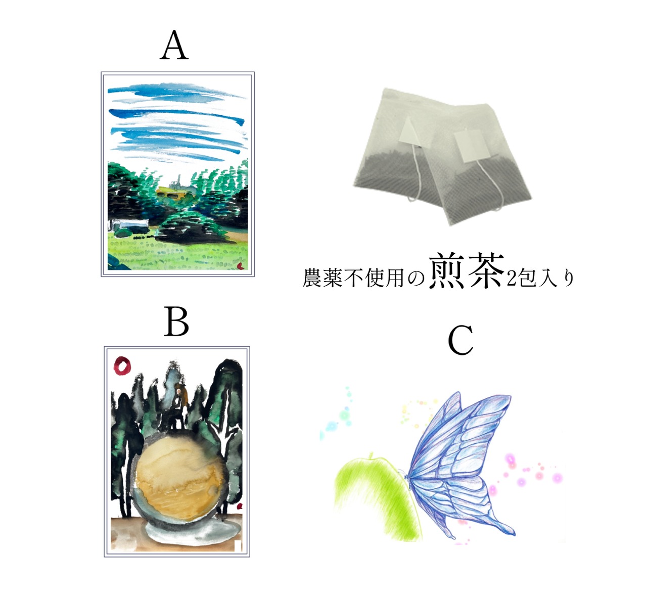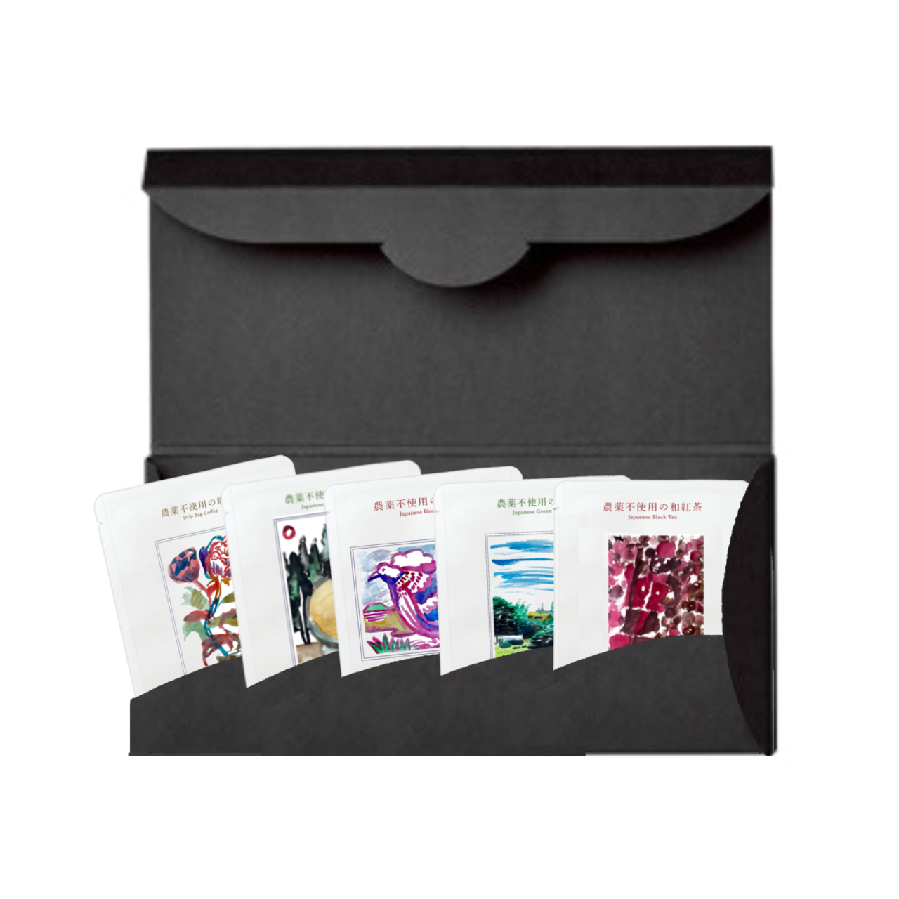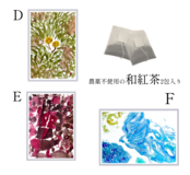 煎茶、和紅茶、珈琲にそれぞれ6種類のアートパッケージがあります。煎茶と和紅茶はティーバッグ 2包入り、珈琲はドリップバッグ1包入りです。