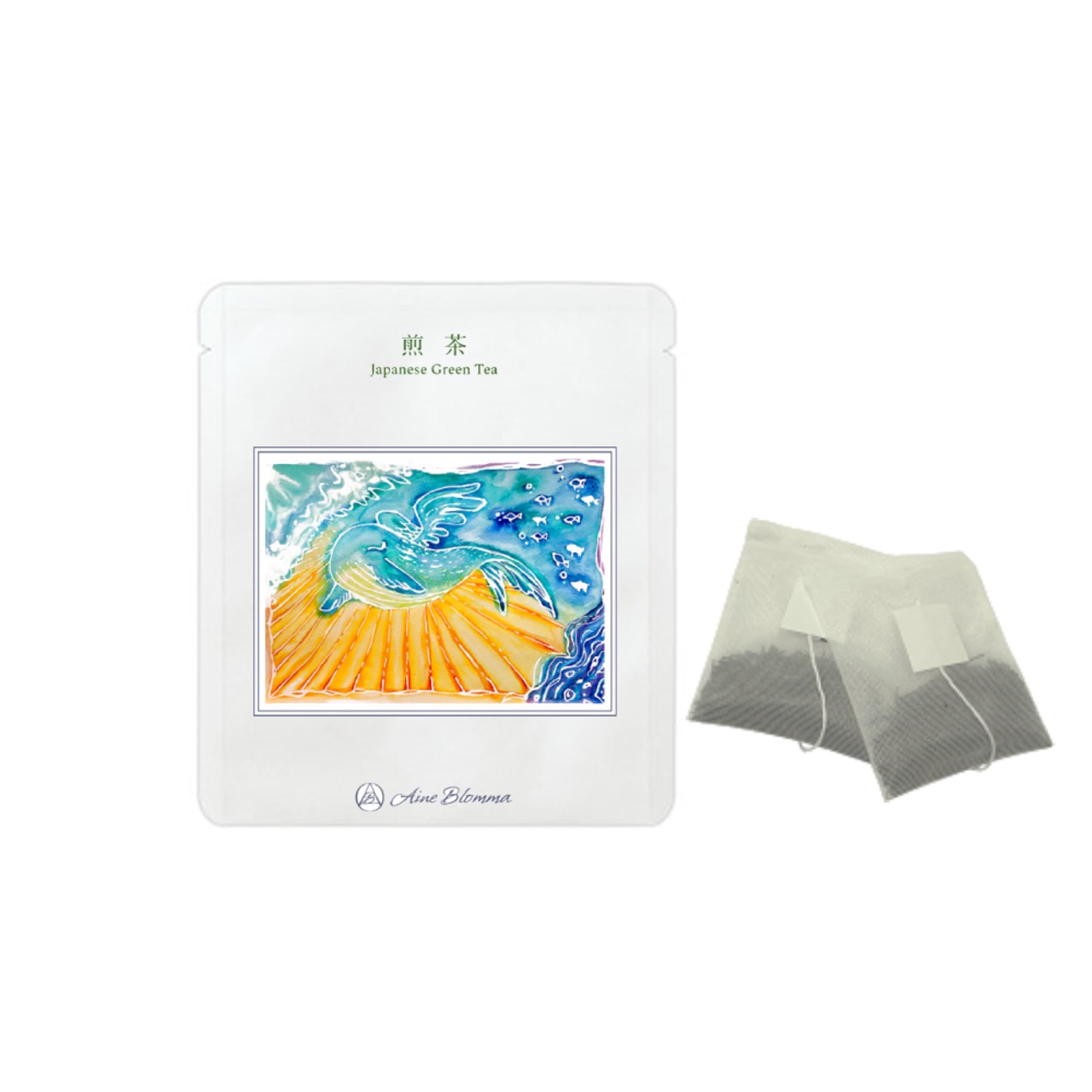 煎茶ティーバッグ2包をアートのパッケージで包みました。茶葉には田勝園の狭山茶を使用しています。