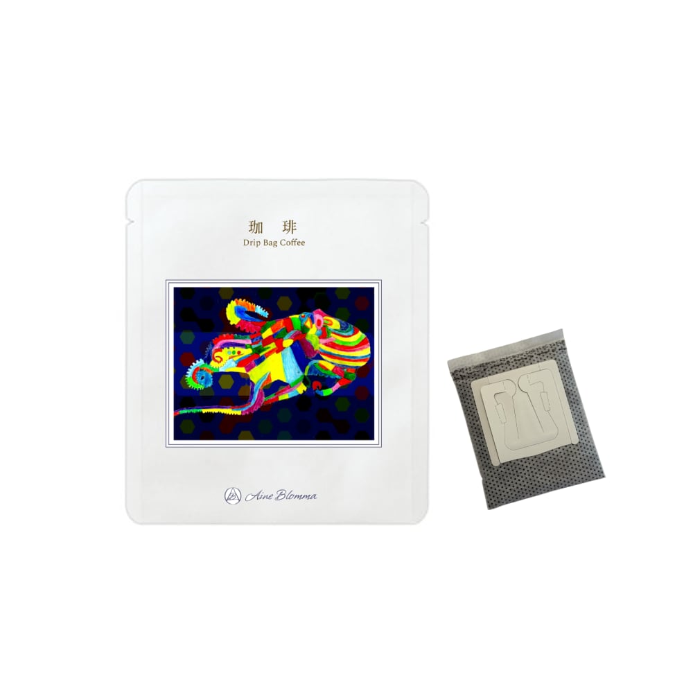 珈琲ドリップバッグ1包ををアートのパッケージで包みました。鳥取珈琲館のフェアトレード&オーガニック珈琲を使用しています。