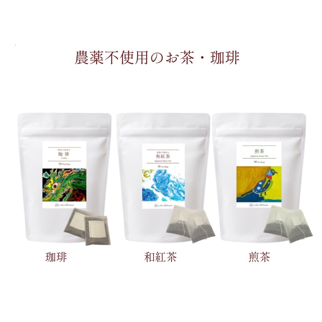 農薬不使用の煎茶、和紅茶、珈琲(ティーバッグ・ドリップバッグタイプ)の中からお好きなもの2つと、クッキー1つのセットです。クッキーは、プレーン、チーズ、ハニーソルトの3種類からお選びいただけます。