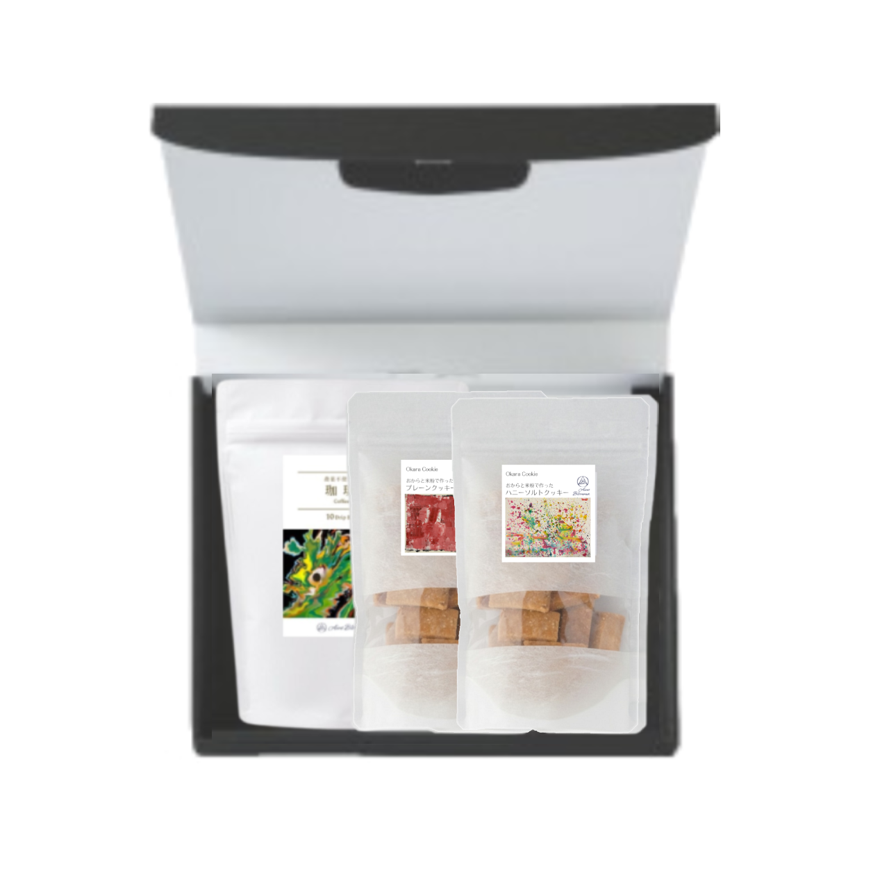 農薬不使用の煎茶、和紅茶、珈琲(ティーバッグ・ドリップバッグ)の中からお好きなもの1つと、クッキー2つのセットです。クッキーは、プレーン、チーズ、ハニーソルトの3種類からお選びいただけます。