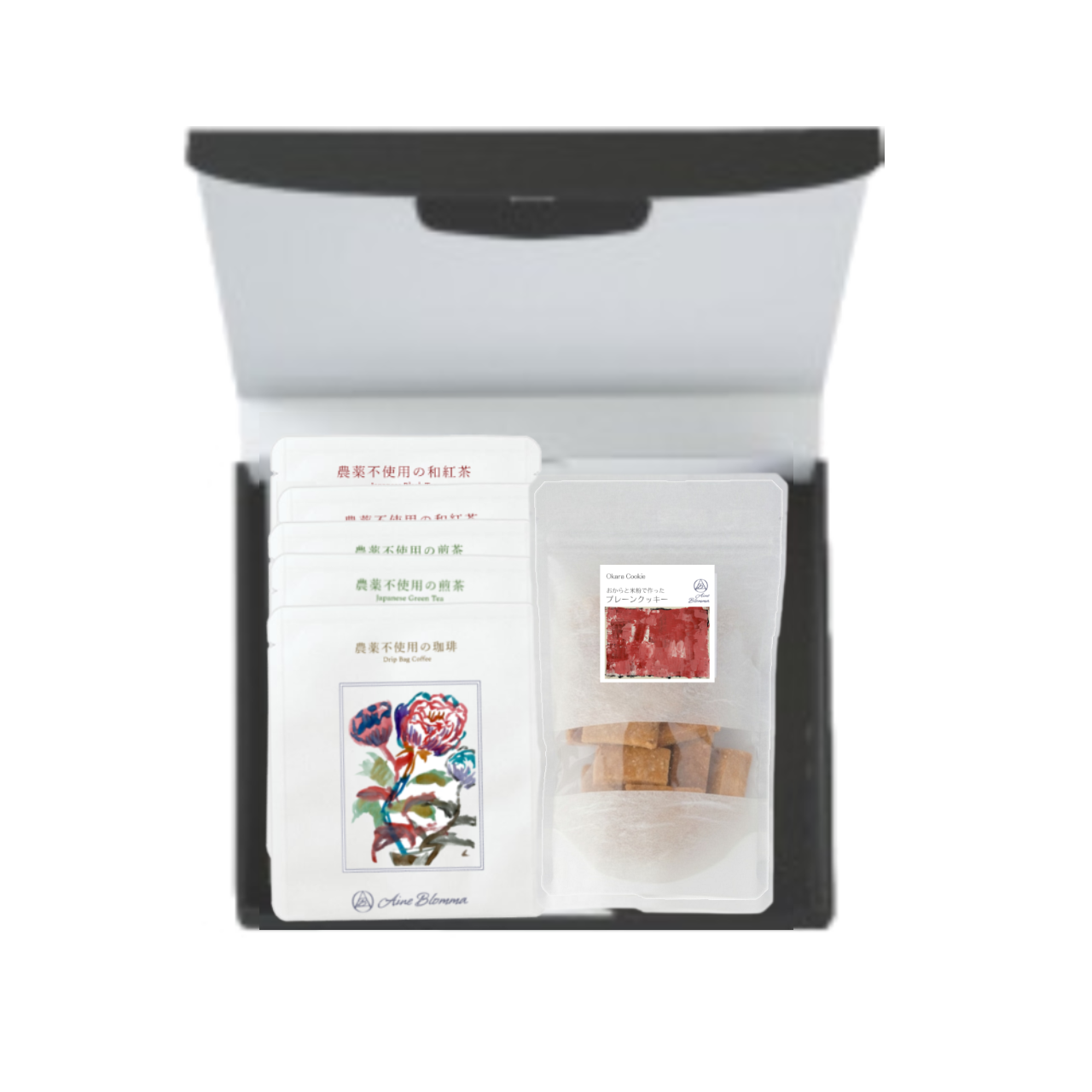 個別包装タイプのお茶・珈琲(煎茶、和紅茶、珈琲)5つとクッキー1つのセットです。